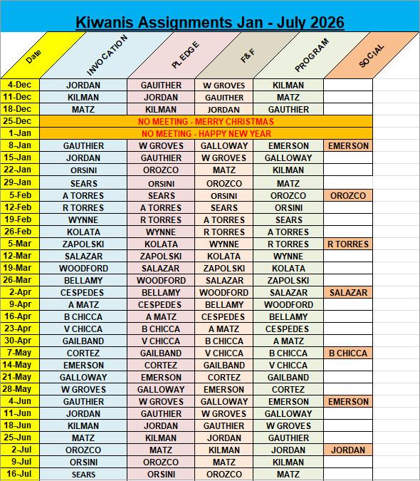 Club Meeting Assignments for Jan-Jul 2026